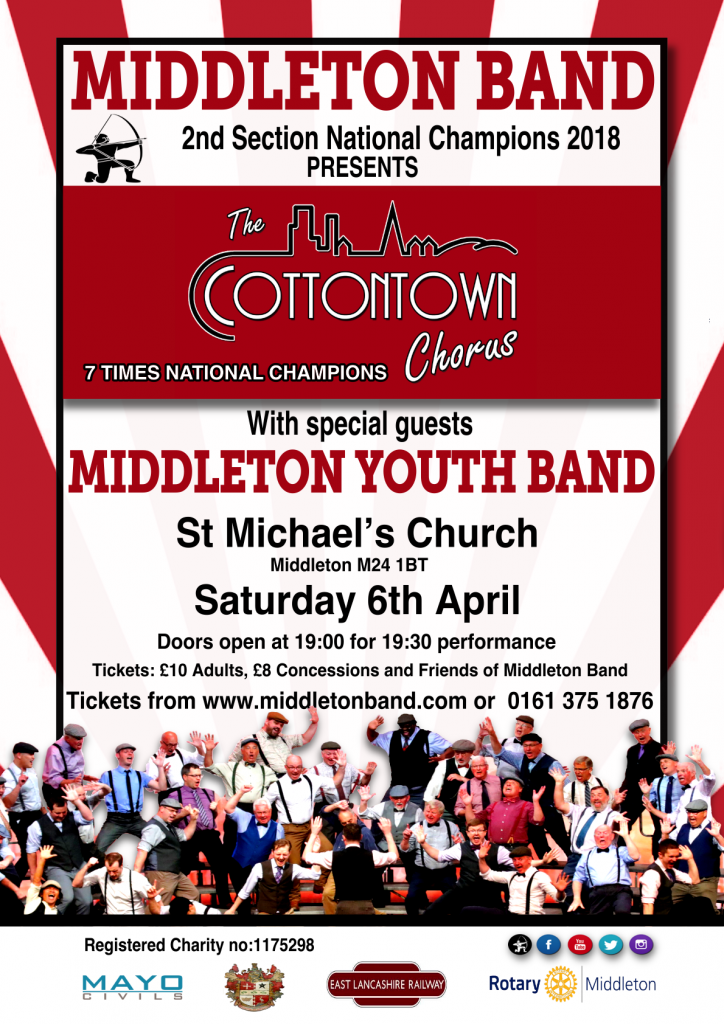 Join us at 7.30pm on Saturday 6th April 2019 at St Michael’s Church, Middleton, for a fun packed evening of music from Middleton band, Middleton youth band and the fantastic Cottontown Chorus.